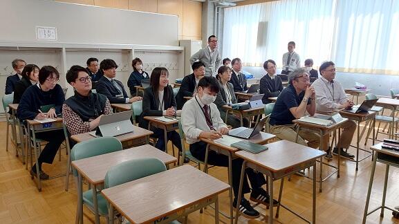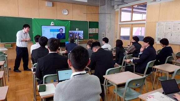 研修では、教員役と生徒役に分かれ、遠隔授業における留意点や資料提示の工夫について、実際の授業形式で体験的に学びました。生徒の主体的な学習を促すための具体的な手立てについて理解を深めることができました。