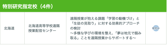 本センターでは、本実践研究助成に3年連続応募し、助成先として認定されました。今年度から2年間は研究主題を『遠隔授業が抱える課題「学習の動機づけ」と「生徒の見取り」に対する効果的アプローチの検討~多様な学びの環境を整え、「夢は地元で掴み取る」ことを遠隔授業からサポートする~』と設定し、遠隔授業において生徒の自己調整学習能力を高める方法について、研究と実践を進めていきます。